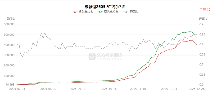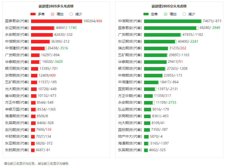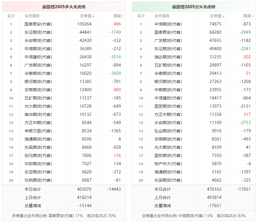 总体而言,碳酸锂2605合约今日减仓上行,多空持仓排名前20席中,多空双方均呈退场态势,多头退场意愿弱于空头。